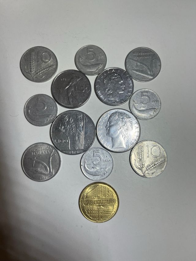 Detalles del productoConjunto de monedas italianas de diferentes valores y épocas.