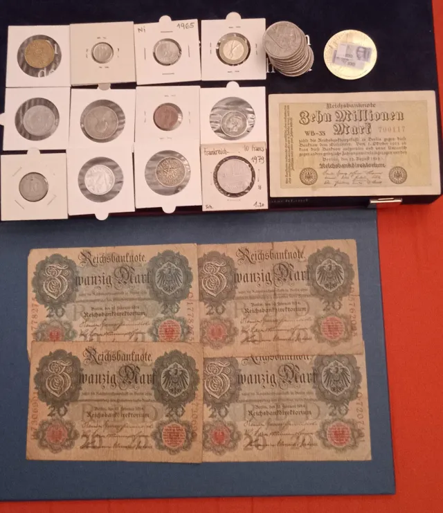 Detalles del productoColección variada de monedas y billetes de diferentes países y épocas. Incluye piezas de Alemania (Reichsbanknote 10 millones de Mark, 20 Mark), Francia (10 Francs 1979) y otras monedas.