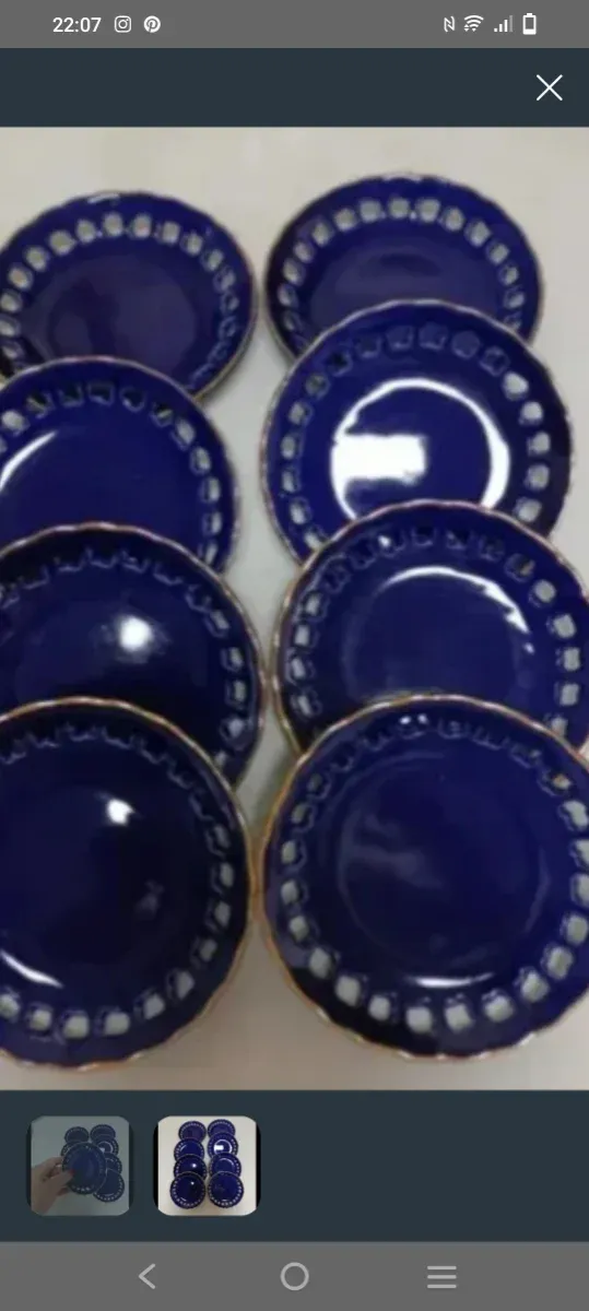 Detalles del productoConjunto de 10 platos de cerámica en un vibrante color azul, con un delicado borde calado y detalles dorados.