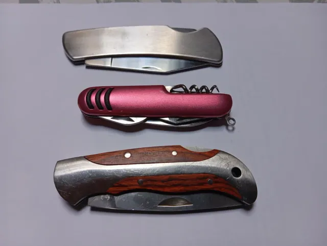 Detalles del productoConjunto de tres navajas multiusos con diferentes diseños y acabados. En muy buen estado, una de ellas nueva.