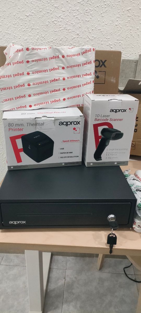 Detalles del productoSe vende lote de negocio con impresora térmica y escáner de códigos de barras y cajón automático billetes y monedas.