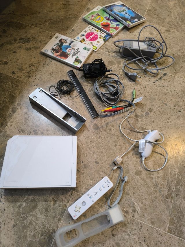 Detalles del productoConsola Nintendo Wii en color blanco, junto con sus accesorios y cuatro videojuegos.