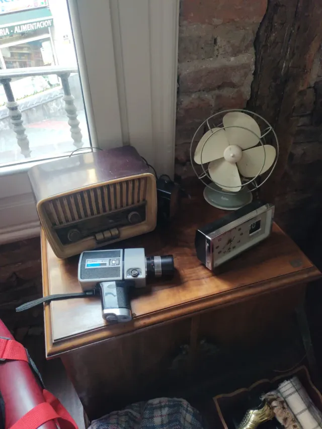 Conjunto de objetos antiguos con un toque retro. - Radio antigua de madera - Cámara de vídeo analógica. - Ventilador de mesa vintage. - Radio metal plástico