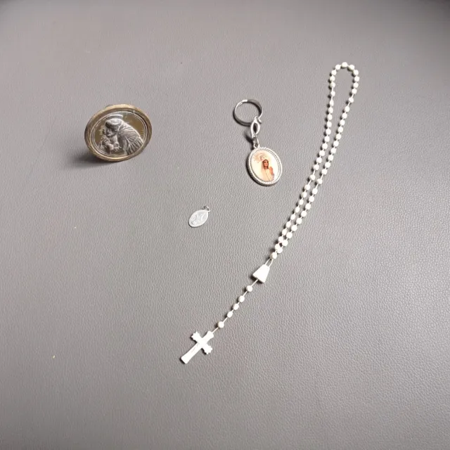 Detalles del productoConjunto de objetos religiosos que incluyen una medalla, un llavero con imagen y un rosario.