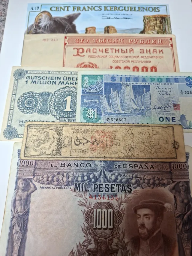 Detalles del productoColección de 6 billetes de diferentes países y épocas.