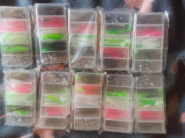 Lote de señuelos de pesca y anzuelos variados. - Incluye varios colores de señuelos blandos. - Anzuelos de diferentes tamaños.