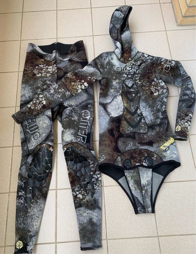 Detalles del productoTraje de neopreno con diseño de camuflaje para pesca submarina. Incluye chaqueta con capucha y pantalón.