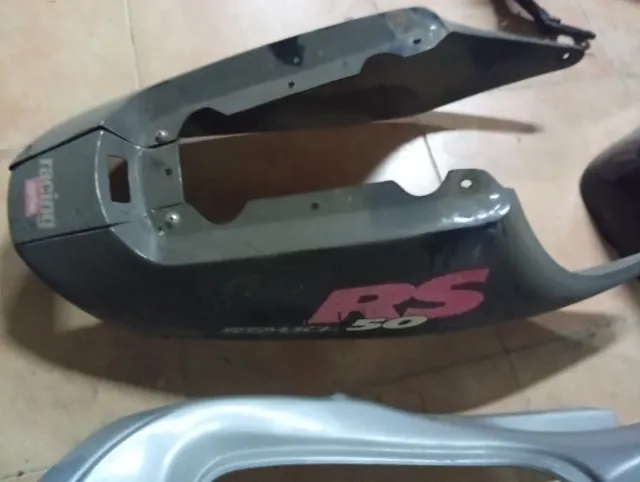 Lote de piezas para Aprilia RS Chesterfield. - Carenado delantero con logo racing. - Carenado lateral con logo RS 50. - Piezas de plástico en color gris oscuro.