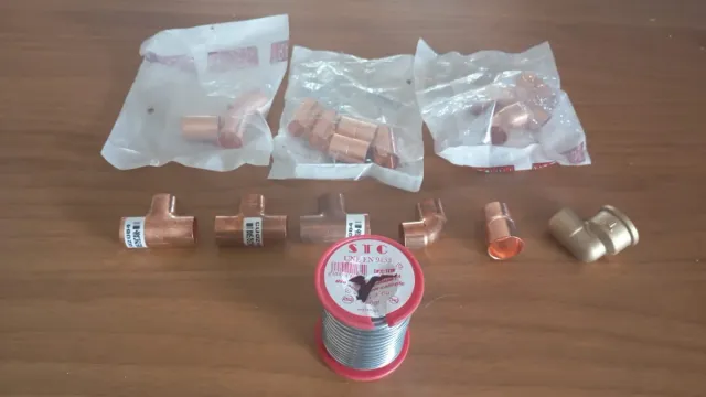 Detalles del productoLote de piezas de cobre de 15mm y rollo de estaño para soldar.