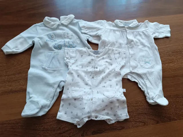 Conjunto de tres pijamas para bebé, talla 0 meses. Incluye: - Pijama azul largo con dibujo de osito y coche - Pijama blanco largo con topos azules - Pijama blanco corto
