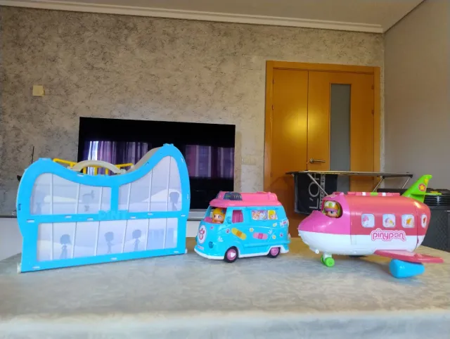 Detalles del productoConjunto de tres juguetes de Pinypon: un avión, un colegio y caravana veterinaria