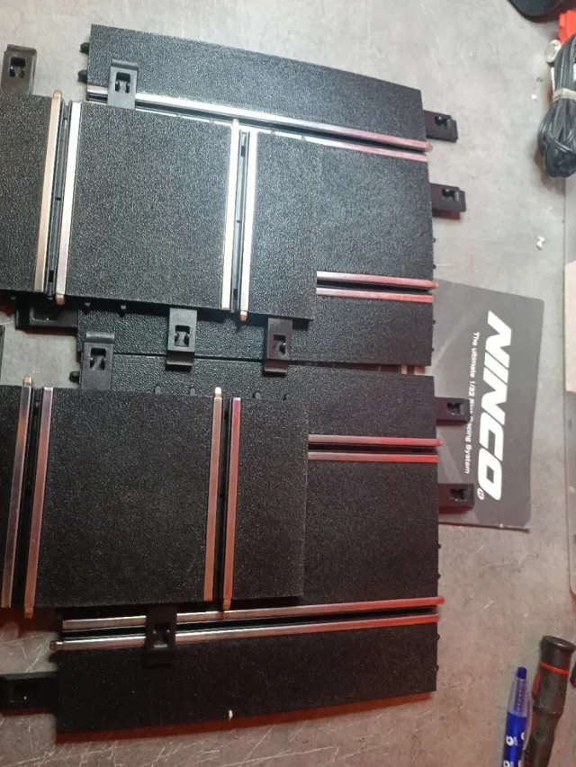Conjunto de pistas para Scalextric Ninco 1/32. 2 rectas de 10cm 2 rectas de 20cm Nuevas - Piezas de plástico negro con guías metálicas. - Clips de unión incluidos.