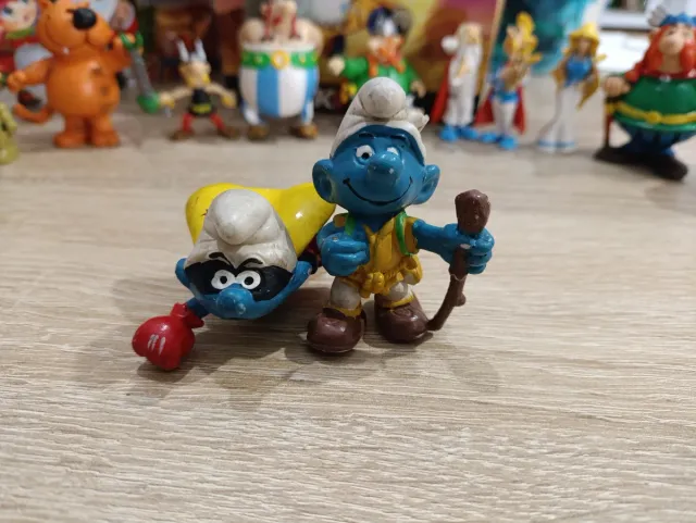 Estado ver fotos, pitufo Superman le falta una base donde va el brazo extendido y a pitufo Excursionista le falta una flor colocada en su hombro.