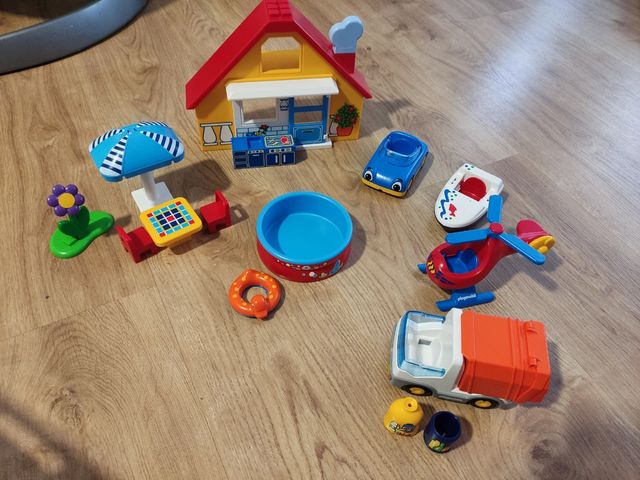 Casa con piscina, coche, barca, helicoptero de bombeross, camión de la basura y cuidador d jirafa, con todos sus complementos y muñecos en perfecto estado.