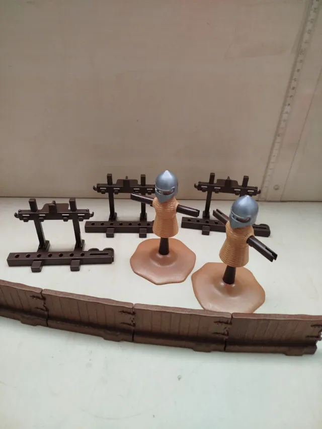Conjunto de accesorios medievales de Playmobil. - Dos figuras de entrenamiento con armadura. - Vallas de madera. - Soportes para entrenamiento.