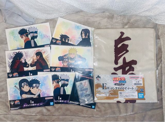Detalles del productoConjunto de varios premios de la lotería Ichiban de Naruto: seis postales, un llavero y una toalla.