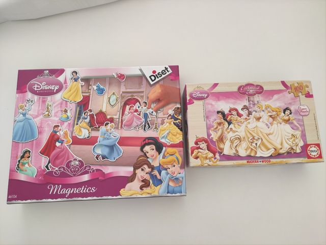 Dos juegos de Princesas Disney. Un puzzle con piezas de madera fina de 100 piezas. Y un juego de figuras magnéticas para poner en dos tableros con diferentes escenarios.... pudiendo cambiarlos como quieras.