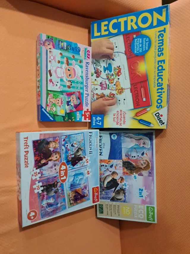 Detalles del productoLote de juegos infantiles que incluye puzzles y un juego educativo.