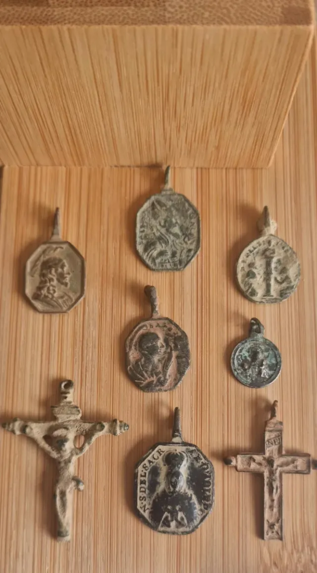 Conjunto de medallas y cruces religiosas antiguas. - Piezas de metal con grabados. - Variedad de diseños y tamaños. - Ideal para coleccionistas. 6 medallas , 1 de plata