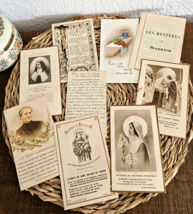 Incluye representaciones de la Virgen María, Cristo crucificado, San Antonio de Padua, Le Vénérable Libermann, un cuadernillo de los Misterios del Rosario y una estampa manuscrita original.