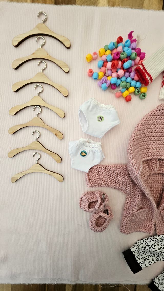 Detalles del productoConjunto de ropa y accesorios para muñecas de diferentes tamaños. Incluye prendas de vestir, zapatos y perchas.