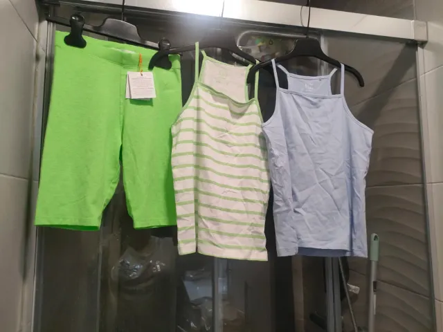 Conjunto de tres prendas de ropa para niña. - Pantalón corto color verde lima. - Camiseta de tirantes a rayas verdes y blancas. - Camiseta de tirantes color azul claro.