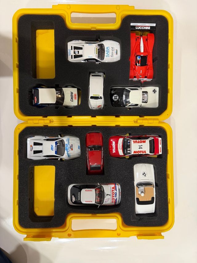 Lote de coches Scalextric Tecnitoys 1:32. Modelos variados: rally, clásicos y prototipo. Incluye maletín rígido amarillo. No se vende por separado.
