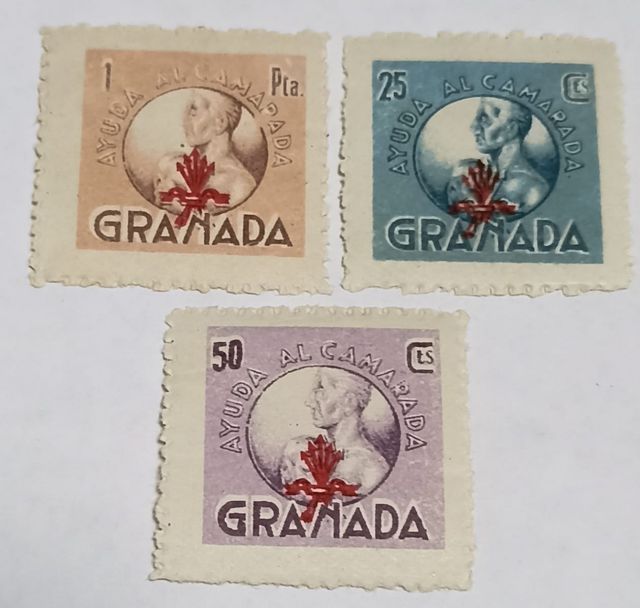 Detalles del productoLote compuesto por 3 sellos antiguos españoles serie completa de Ayuda al Camarada Granada. Guerra Civil Española.