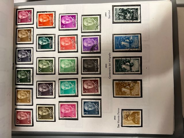 Conjunto de sellos españoles del año 1950 al 1980 usados, algunos años incompletos, están las hojas pero falta algún sello.