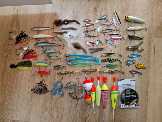 Detalles del productoSeñuelos de todo tipo para pescar depredadores, spinnerbait, jerkbait, vinilos, pikis, cucharillas, señuelos de superficie, streamer hechos a mano que son una delicia para las truchas, veletas, poteras de muchos tamaños, plomos cebadores, buldo para pescar con pan a flote, un buen kit para principiantes para tener un poco de todo, la mayoria esta sin estrenar. Todo esta valorado en mas del doble. Marcas sakura, nomura, caperlan,... Se podria negociar un poco el precio.