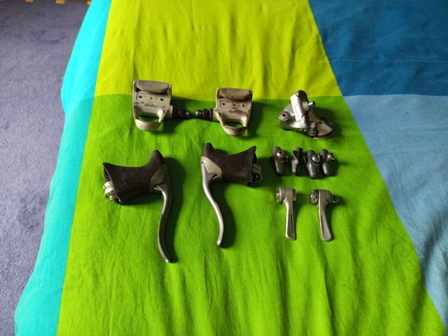 Lote de: desviador trasero, mandos de cambio, manetas de freno y 2 juegos de zapatas todo Shimano 600, de regalo, unos pedales 105