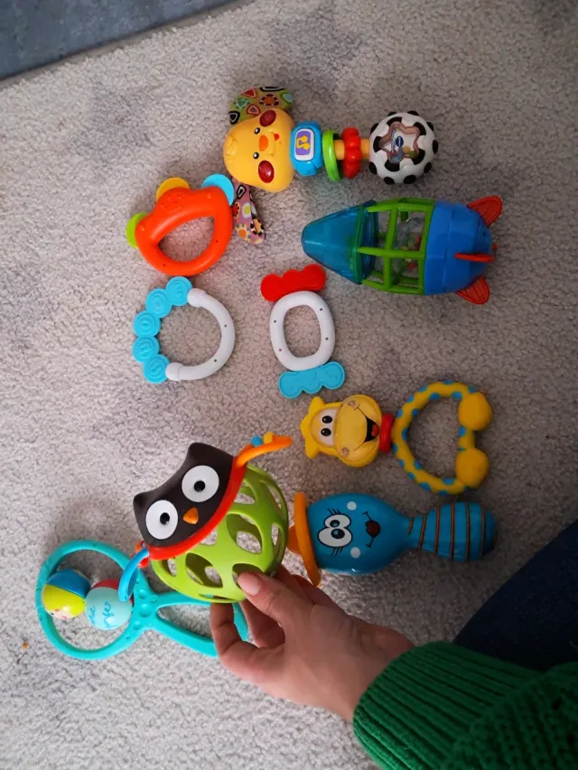 Conjunto de sonajeros de colores variados para bebés. - Incluye sonajeros con formas de animales y objetos. - Diseños alegres y llamativos. - Materiales seguros para bebés.