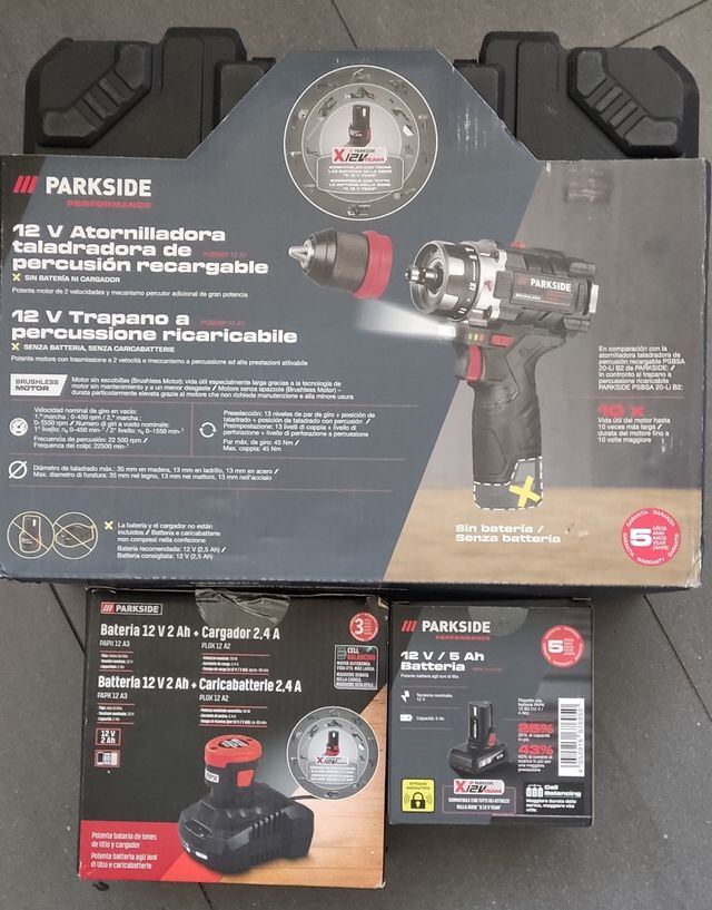 Detalles del productoSe vende lote de taladro percutor Parkside de 12V.