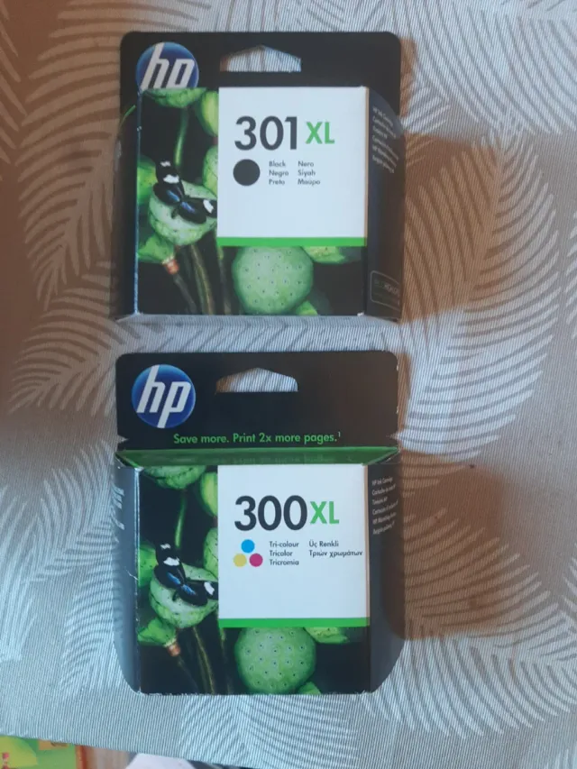 Se vende lote de dos cartuchos de tinta HP, uno negro y otro tricolor, ambos modelo XL. - Cartucho HP 301XL Negro. - Cartucho HP 300XL Tricolor.
