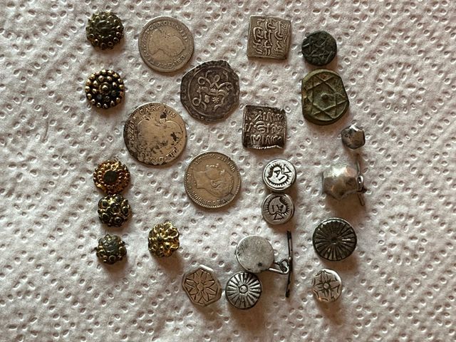 Detalles del productoLote variado de objetos antiguos, incluyendo monedas y abalorios.