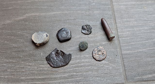Detalles del productoLote Monedas (Felipe II - Felipe IV), botón, bala guerra civil y marchamo antiguos.