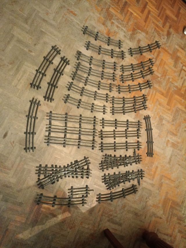 Detalles del productoLote de vías antiguas para trenes eléctricos en escala 0. Tipo Paya Rico. Desconozco marca. Base con listones de madera. Conserva pátina antigua. Para que brille habría que limpiarlas un poco. Incluye el lote 19 curvas, 6 rectas, una mini recta y un cruce y dos cambios de vía. El cruce y los cambios de vía son eléctricos. Incluye tope de vía que no sale en la foto.