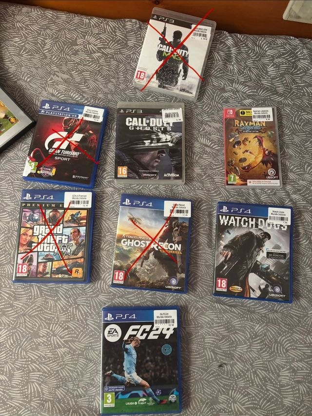 En su caja · EA Sports y Sony y Ubisoft · Call of Duty Ghosts y FC 24 y Gran Turismo Sport y Grand Theft Auto V y Rayman Lege · Acción y aventura