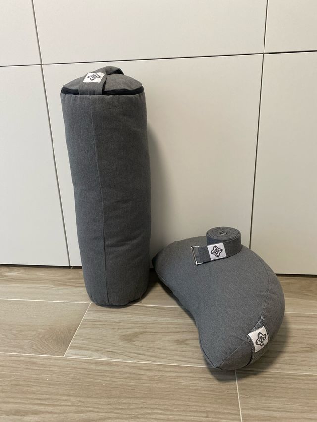 Conjunto de accesorios de yoga en color gris. - Bolster cilíndrico. - Zafu (cojín de meditación) con forma. - Cinturón de yoga de algodón