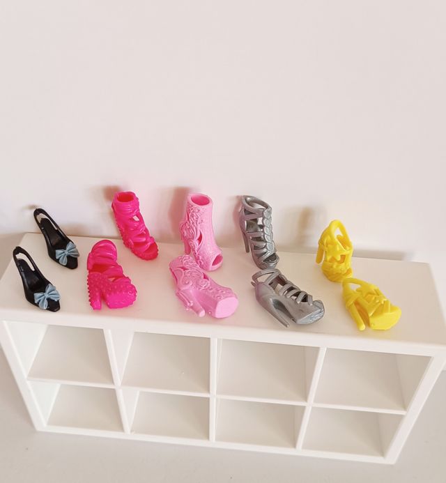 Lote de zapatos para muñecas Barbie. - Incluye 4 pares de zapatos. - Variedad de estilos y colores: negro, rosa, plateado y amarillo. - Diseños modernos y detallados.