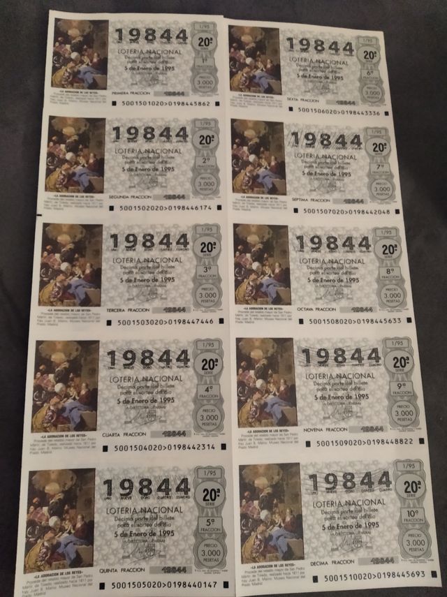 Varios pliegos enteros de décimos (unidos entre sí) lotería Nacional de 5 de enero de 1995 (sorteo lotería del niño). Impecables todos.