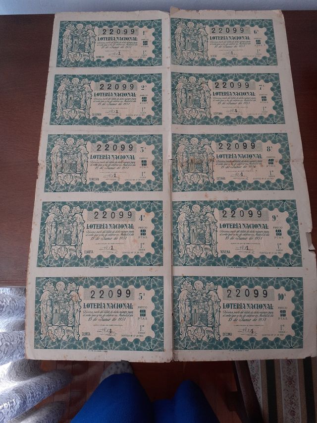 billete completo de 10 décimos de loteria nacional del sorteo 15 de junio de 1951