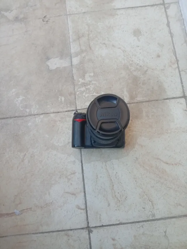 Cámara réflex Nikon con tapa de objetivo. - Cuerpo de cámara negro. - Tapa de objetivo Nikon.