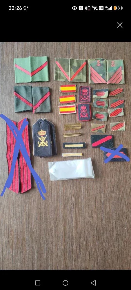 Galones variados,de soldado, aspirante y cabo, barras de antigüedad y galletas de especialidad antiguas de infantería de marina, palas de cabo primero, suboficial ,oficial, armada española, precio a convenir en función de lo que quieras