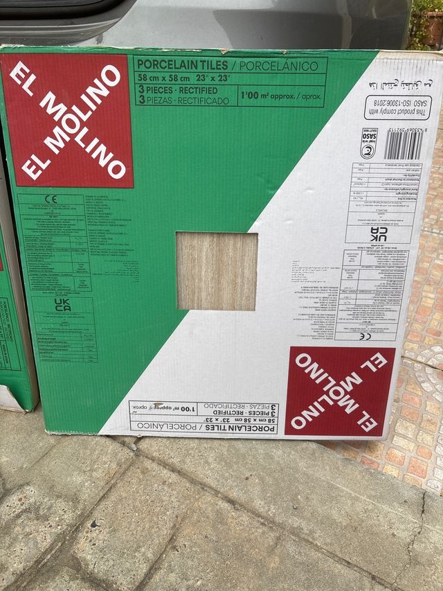 Detalles del producto2 Cajas de baldosas de porcelánico de la marca El Molino. Son aptas para interior y tienen un acabado rectificado.