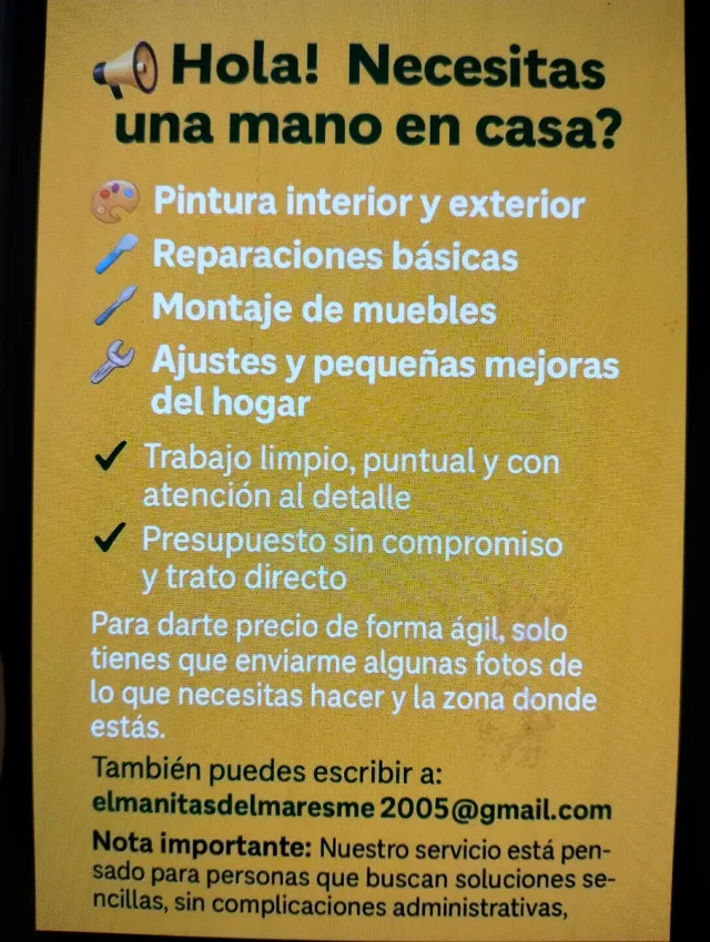SE HACEN TODO TIPO DE PEQUEÑAS REPARACIONES DEL HOGAR FONTANERIA ELECTRICIDAD PINTURA ETC PRESUPUESTO SIN COMPROMISO MAXIMA SERIEDAD Y PROFESIONALIDAD TELEFONO CONTACTO 6039882067
