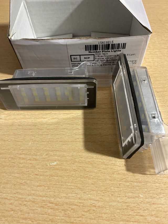 Detalles del productoJuego de luces LED para matrícula, compatibles con Clío y Megane. Son luces de bajo consumo y larga duración.
