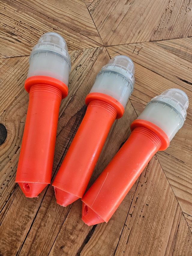 Detalles del producto Lote de Tres luces de señalización para redes de pesca, en buen estado. Son de color naranja y blanco. Ideales para asegurar la visibilidad de tu red.