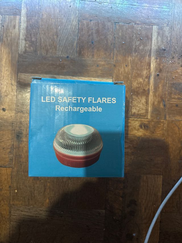 Luz de seguridad LED recargable para emergencias. - Diseño compacto y portátil. - Base roja y parte superior transparente con rejilla.