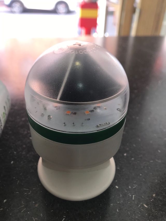 Luz de emergencia con panel solar y luces LED. - Diseño esférico con parte superior transparente. - Banda verde decorativa. - Base blanca.